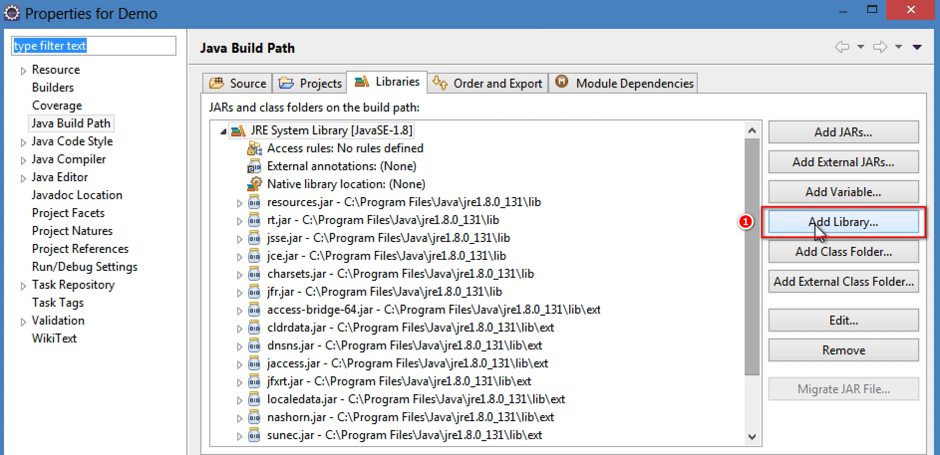 步骤2:在弹出的“Properties for 项目名称”对话框中点击右侧的“Add Library…”按钮